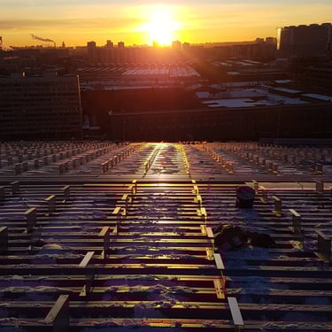 The surface without adjustable profiles was unsuitable for installing a RIB-ROOF system. Therefore, the surface was measured with a Leica s910 device and compared to the original model. It was found that the surface differed by about 200 mm. We developed a special tool and structure to track and maintain the surface height. According to design requirements, we attached the design line to the zinc surface and then placed the RIB-ROOF steel design elements on top. To achieve this, we increased the density of adjustable profiles under the connection points.