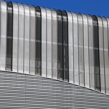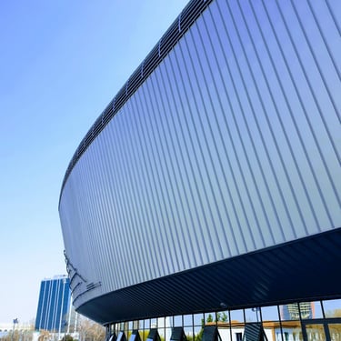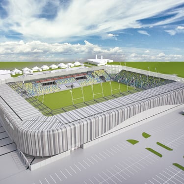 The uniqueness of the building lies in its custom "BARCODE" patterned facade, where transparency is enhanced by perforated facade panels, giving it an airy feel. After visualizing the architectural concept, the task was to develop the details and manufacturing drawings. The building is characterized by the use of various materials, from the meticulously detailed fence cladding to the translucent grandstand canopy.