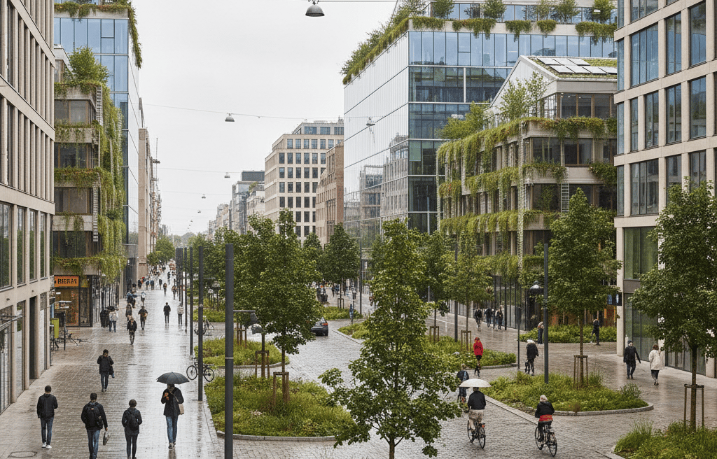 A BauGB (Baugesetzbuch – Építési Törvénykönyv) 2022-es módosítása lehetővé teszi az önkormányzatok számára, hogy zöld infrastruktúra-kvótákat írjanak elő: minden új lakó- és ipari fejlesztésnek bizonyos arányban kell zöldtetővel, árnyékoló fával vagy esővíz-visszatartó rendszerrel rendelkeznie.
